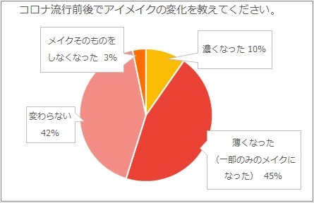 Withコロナ時代の化粧について調査 女性7割 自分のメイク変わった 69 5 と回答 外出時の化粧 目元のみ 40 0 が最多 9割 口紅 塗らなくなった 3 東京イセアクリニック 医療法人社団心紲会 のプレスリリース